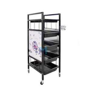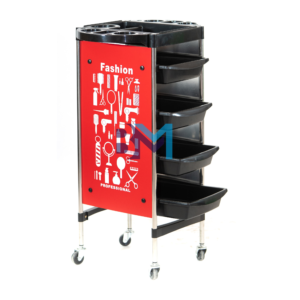 Carrito auxiliar de barbería y peluquería con 4 bandejas extraíbles. La parte superior del carrito cuenta con varios compartimentos y soportes para colocar los aparatos de uso del profesional. Montaje fácil y rápido sin necesidad de herramientas.
