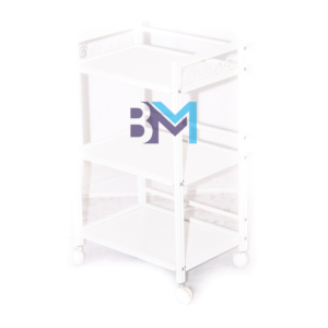 Carrito auxiliar de barbería y peluquería con un diseño moderno cuenta con 4 bandejas extraíbles y un soporte lateral para el secador. Montaje fácil y rápido sin necesidad de herramientas.