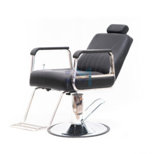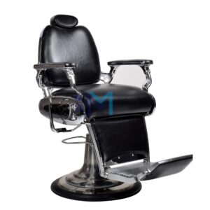 Sillón de barbería de color negro cuanta con un diseño ideal para un salón de estilo vintage y retro gracias a su tapizado y a sus molduras de aluminio de aspecto elegante, resistente y funcional.