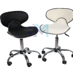 Taburete con respaldo tipo pony en polipiel color negro y base de ruedas, ayuda a mantener una postura correcta. Es regulable en altura. Disponible en color blanco y negro.