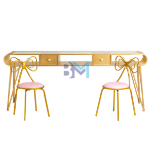 Mesa de manicura triple nos ofrece un diseño clásico y elegante con superficie de cristal y estructura de metal color dorado, doble cajonera y amplio espacio de almacenamiento para esmalte de uñas, lámparas y otros suministros.