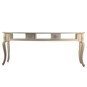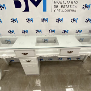 Mesa de manicura triple blanca con diseño vintage, superficie de cristal y detalles tallados decorativos. Cuenta con dos cajoneras y amplio espacio de almacenamiento.