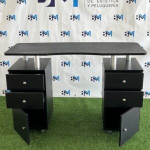 0.00 €Mesa de manicura negra con superficie de madera. Cuenta con amplio espacio de almacenamiento, cuatro cajoneras y ruedas que facilitan su movilidad.