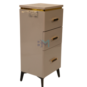Mueble auxiliar con diseño moderno y elegante en color blanco y detalles en dorado, cuenta con tres cajoneras, es ideal para cualquier centro de belleza como apoyo para el profesional.
