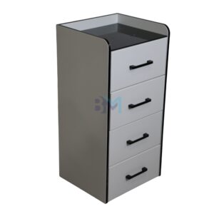 Mueble auxiliar con diseño moderno y elegante en color blanco con negro, cuenta con cuatro cajoneras y amplio espacio de almacenamiento, es ideal para cualquier centro de belleza como apoyo para el profesional.