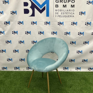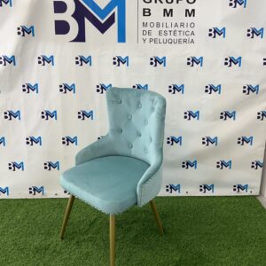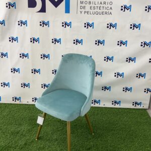 Silla tapizada en terciopelo color azul , disponible con patas doradas y con base de ruedas . Su silueta sencilla y su amplio respaldo la hacen una silla muy cómoda y moderna.