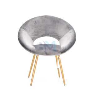Silla tapizada en terciopelo color gris , disponible con patas doradas y base de ruedas . Su silueta sencilla y su amplio respaldo la hacen una silla muy cómoda y moderna.