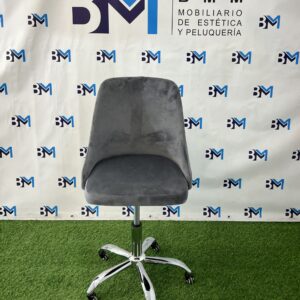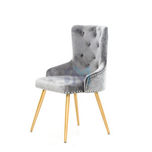 Silla tapizada en terciopelo tipo chéster color gris , disponible con patas doradas y con base de ruedas . Su silueta sencilla y su respaldo tipo rey la hacen una silla muy cómoda y moderna.