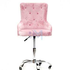 Silla tapizada en terciopelo tipo chéster color rosado , disponible con patas doradas y base de ruedas. Su silueta sencilla y su respaldo tipo rey la hacen una silla muy cómoda y moderna.