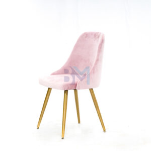 Silla tapizada en terciopelo color rosado . Su silueta sencilla y su respaldo tipo rey la hacen una silla muy cómoda y moderna.