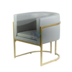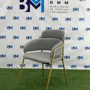Silla tapizada en polipiel disponible en color gris, con estructura en acero dorado. Su silueta sencilla y su amplio respaldo la hacen una silla muy cómoda y moderna.