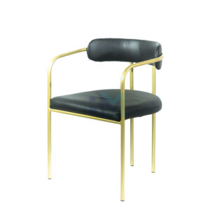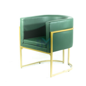 Silla tapizada en polipiel disponible en color verde, con estructura en acero dorado. Su silueta sencilla y su amplio respaldo la hacen una silla muy cómoda y moderna.