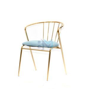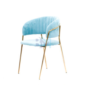 Silla tapizada en terciopelo azul, con estructura en acero dorado. Su silueta sencilla la hacen una silla muy cómoda y moderna.