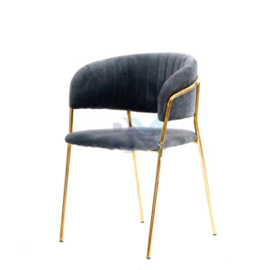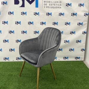 Silla tapizada en terciopelo gris con estructura en acero dorado. Su silueta sencilla la hacen una silla muy cómoda y moderna.