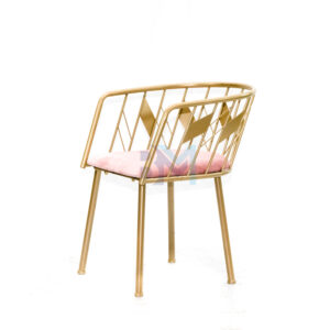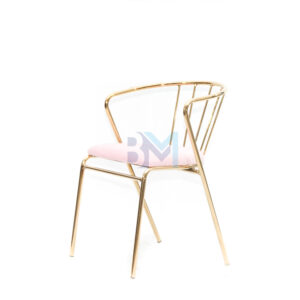 Silla tapizada en terciopelo rosa, con estructura en acero dorado. Su silueta sencilla la hacen una silla muy cómoda y moderna.