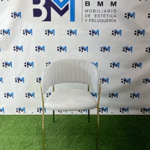 Silla de manicura en terciopelo color gris , disponible con patas doradas . Su silueta sencilla y su amplio respaldo la hacen una silla muy cómoda y moderna.
