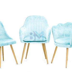 Silla de manicura tipo ostra en terciopelo azul, disponible con patas doradas y base de ruedas . Su silueta sencilla y su amplio respaldo la hacen una silla muy cómoda y moderna.