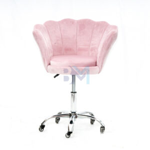 Silla de manicura tipo ostra en terciopelo rosado , disponible con patas doradas y base de ruedas . Su silueta sencilla y su amplio respaldo la hacen una silla muy cómoda y moderna.