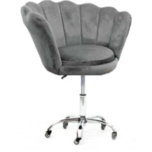 Silla de manicura tipo ostra en terciopelo gris , disponible con patas doradas y base de ruedas . Su silueta sencilla y su amplio respaldo la hacen una silla muy cómoda y moderna.