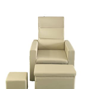 Sillón de pedicura con diseño clásico y elegante tapizado en polipiel de alta calidad en color beige. Incluye bandeja, reposapiés y taburete extraíble tapizados en polipiel. Su diseño ofrece comodidad y confort para los clientes, es ideal para múltiples funciones y así optimizar el espacio.