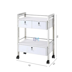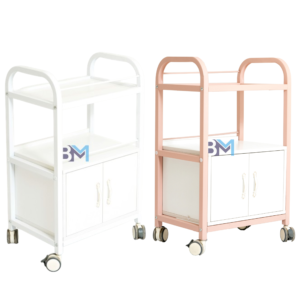 Carrito auxiliar de madera con dos estantes y un gabinete en la parte inferior con amplio espacio para almacenaje. Este carrito es ideal para centros de estética, peluquería, manicura y pedicura. Cómoda movilidad gracias a sus ruedas y asas laterales. Disponible en color blanco y rosado.