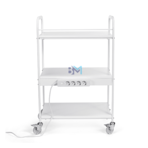 Carrito auxiliar blanco con estructura de metal en color blanco y estantes de madera cuenta con una base con 4 enchufes y un alargador de 1,80m. Cómoda movilidad gracias a sus ruedas y asas laterales.