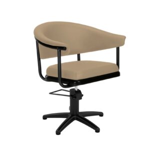Silla de peluquería color beige con diseño clásico, fabricada en polipiel de PVC de alta calidad retardante al fuego. Apoyabrazos, asiento ergonómico para una mayor comodidad y confort.