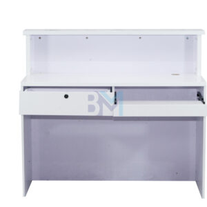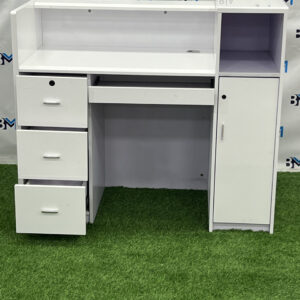 Moderno mostrador de recepción en color blanco con elegantes líneas plateadas ofrece un diseño original ideal para combinar con cualquier estilo. Cuenta con dos cajoneras con cerradura.