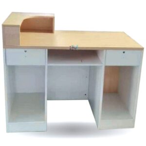 Mostrador de recepción marrón con beige ofrece un diseño elegante, ideal para combinar con cualquier estilo. Cuenta con amplio espacio de almacenaje gracias a su armario con estante interno y cajonera con llaves.