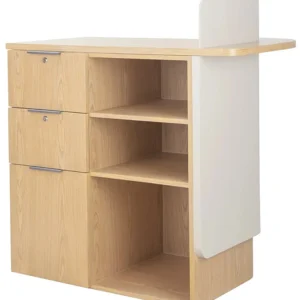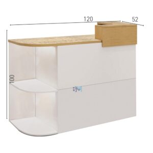 Mostrador de recepción en color blanco y madera ofrece un diseño original y elegante, ideal para combinar con un estilo ecológico y natural. Cuenta con amplio espacio de almacenaje y cajonera con llaves.