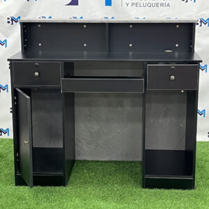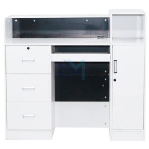 Moderno mostrador de recepción en color blanco y negro con un diseño elegante y original ideal para combinar con cualquier estilo. Cuenta con amplia zona de almacenamiento, cajoneras y armario con estantería interna.