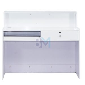 Moderno mostrador de recepción en color blanco con líneas plateadas y base negra ofrece un diseño original ideal para combinar con cualquier estilo. Cuenta con amplia zona de almacenamiento, cajonera con llaves.