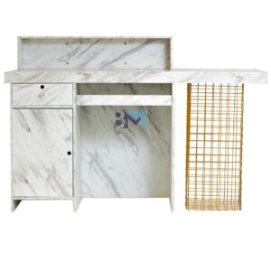 Moderno mostrador de recepción blanco y gris tipo piedra de mármol con detalle lateral decorativo en metal dorado ofrece un diseño moderno y original ideal para resaltar la elegancia en cualquier estilo. Cuenta amplio espacio de almacenamiento, cajonera y armario con llaves.
