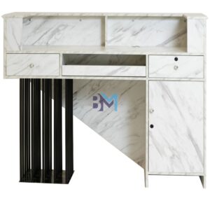 Moderno mostrador de recepción blanco y gris tipo piedra de mármol con detalle lateral decorativo en metal negro ofrece un diseño moderno y original ideal para resaltar la elegancia en cualquier estilo. Cuenta amplio espacio de almacenamiento, cajonera y armario con llaves.