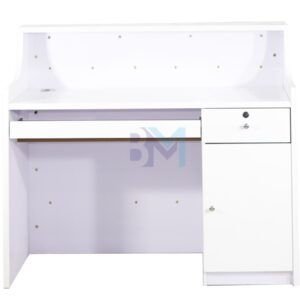 Mostrador de recepción lacado en color blanco con detalles decorativos en negro y rosado ofrece un diseño moderno y original, ideal para dar un toque especial combinado con un estilo elegante. Cuenta con amplia zona de almacenamiento, cajonera y armario con llaves.