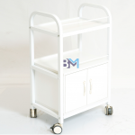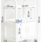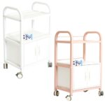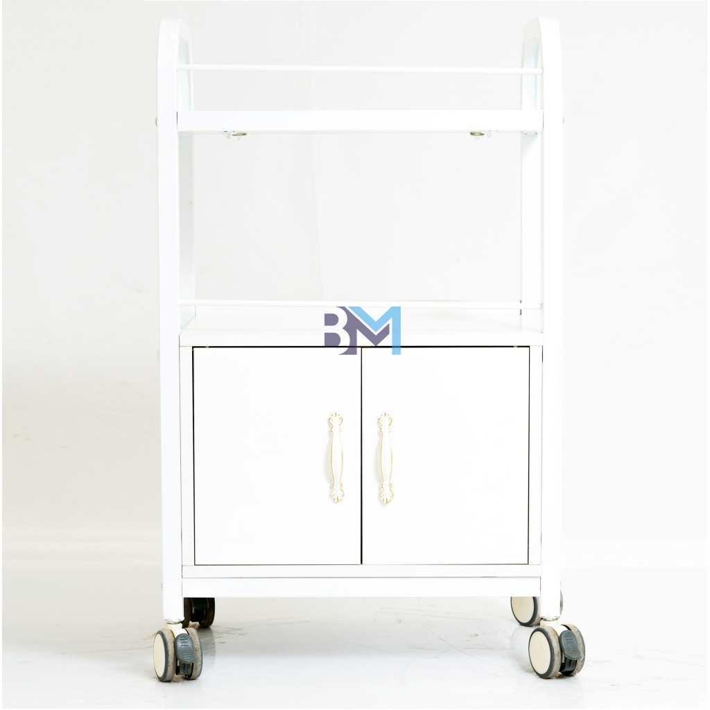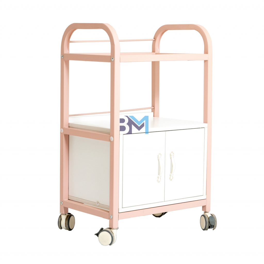 Carrito auxiliar blanco o rosado de madera con dos estantes y un gabinete