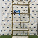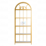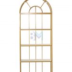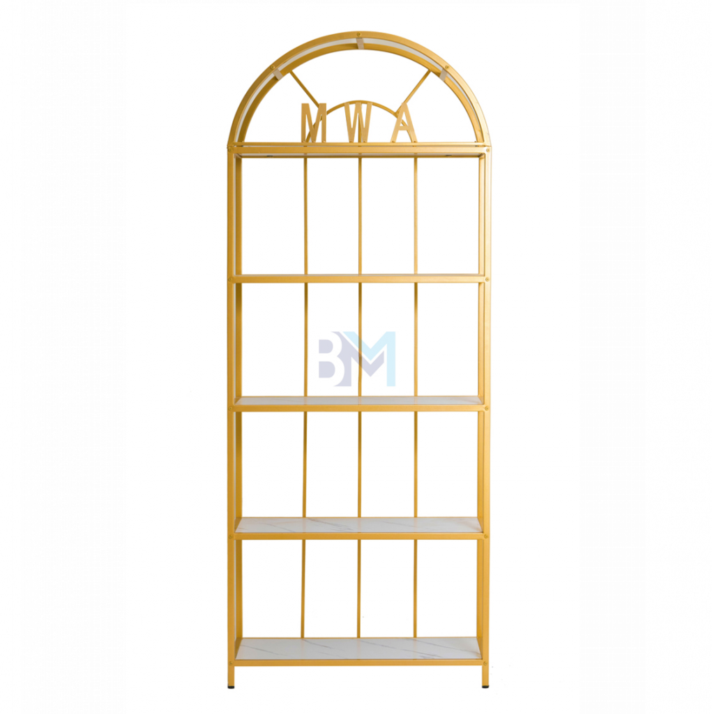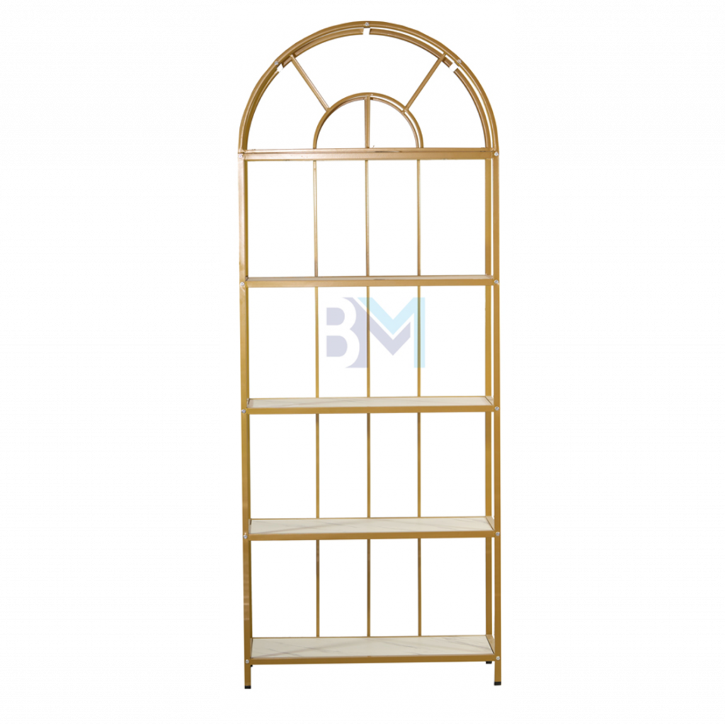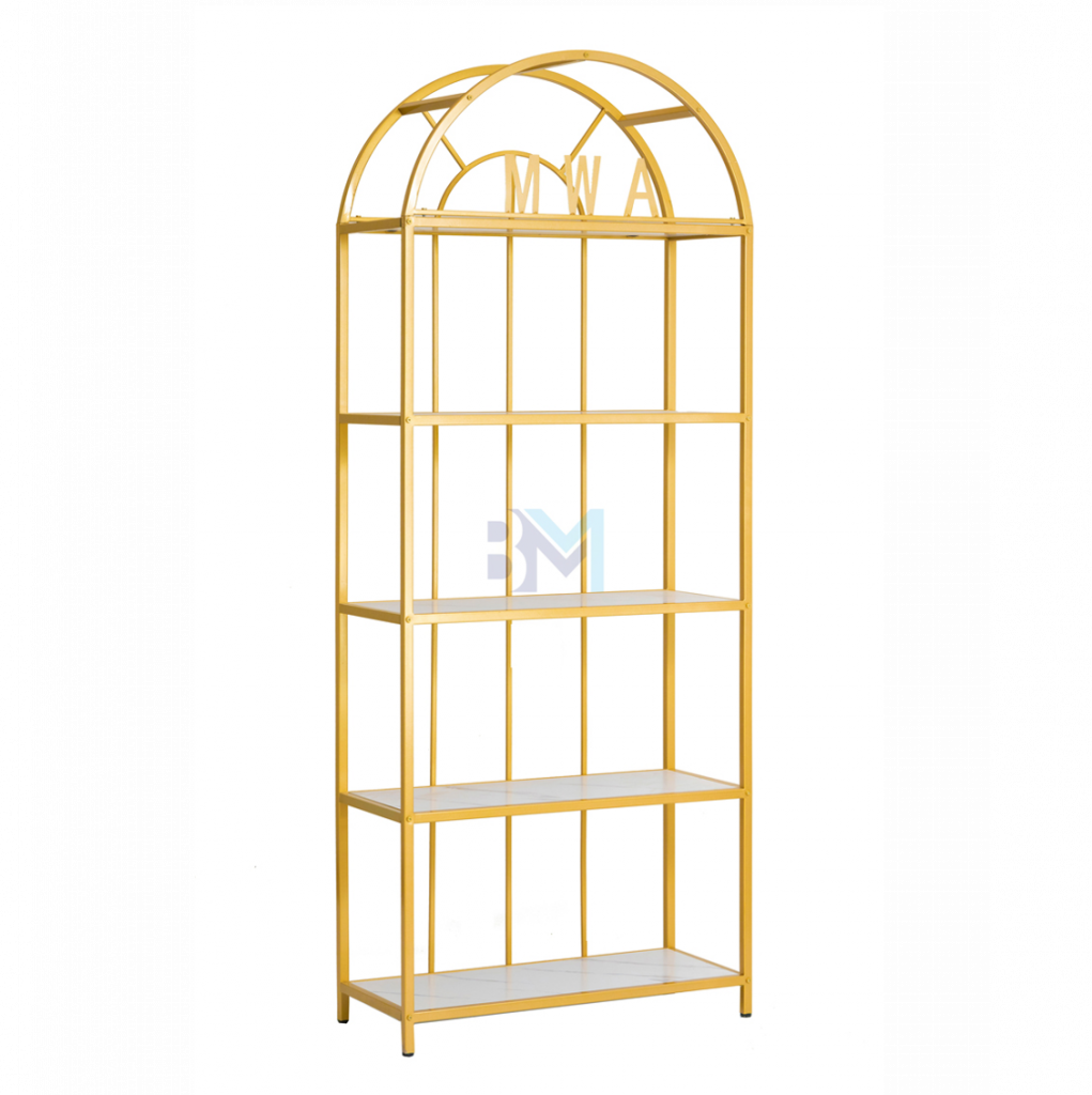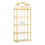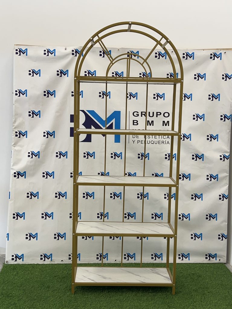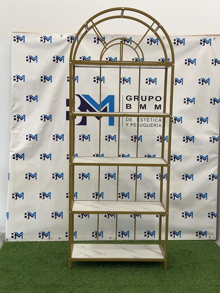 Estantería de metal dorado con repisas en madera tipo mármol