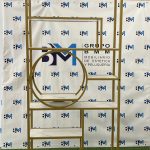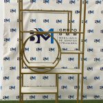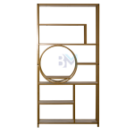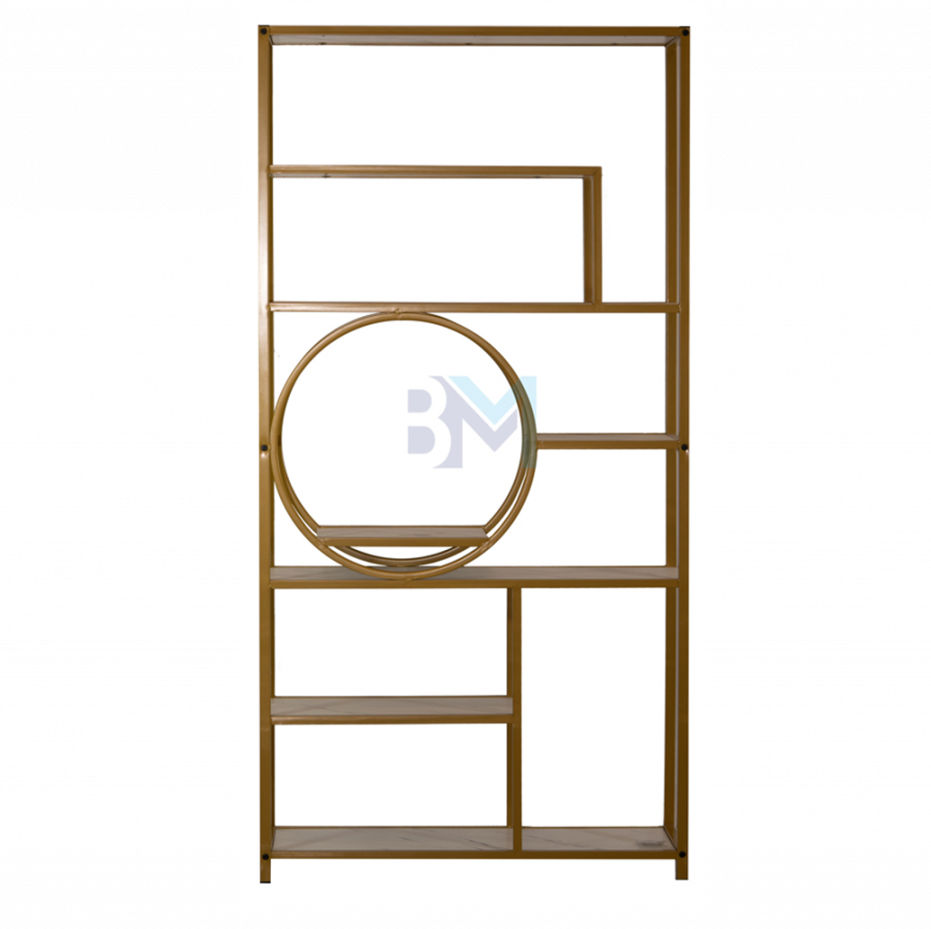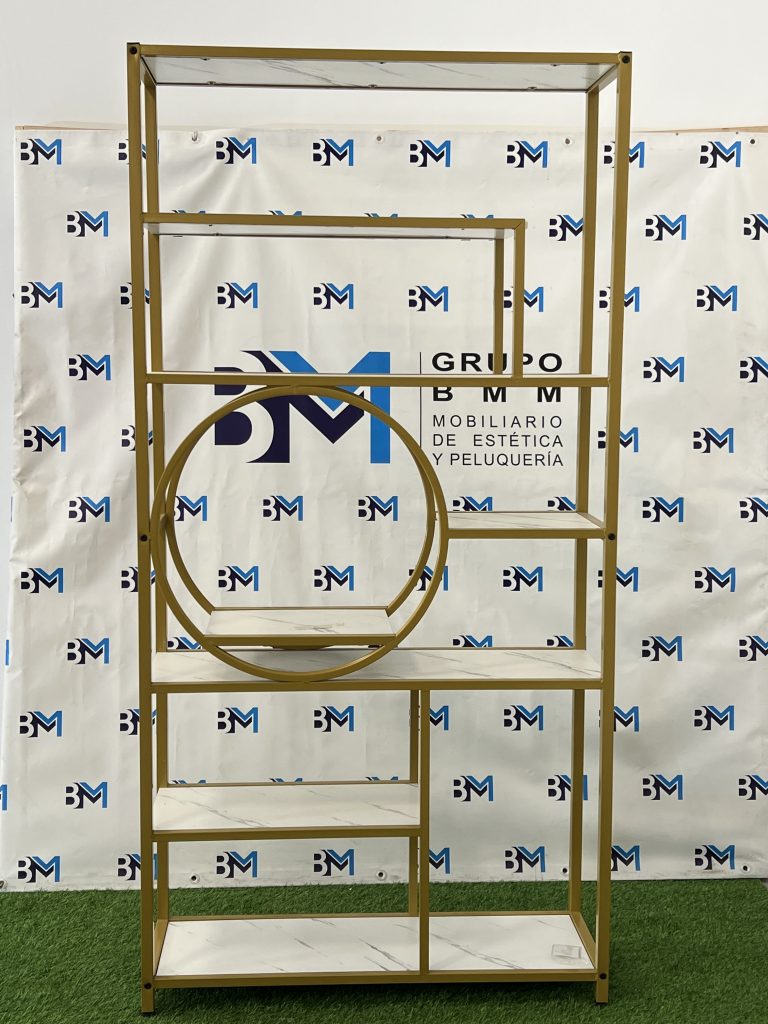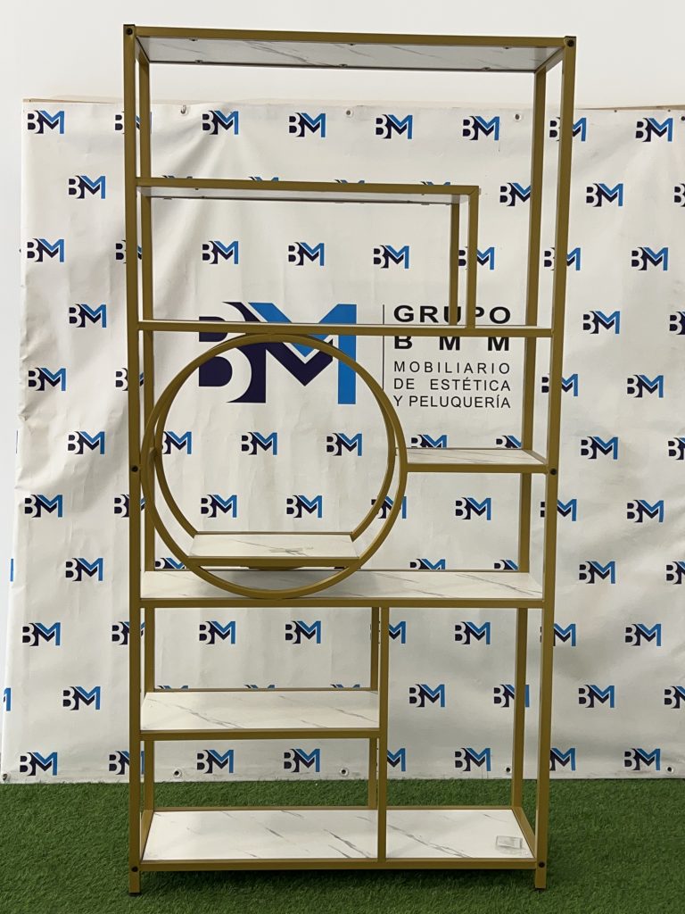 Estantería de metal dorado con repisas en madera tipo mármol