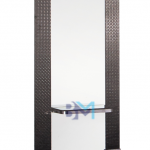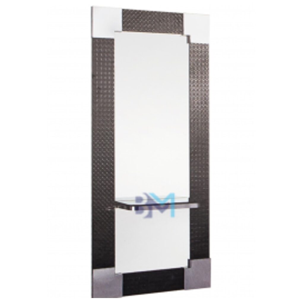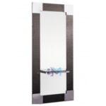 Espejo tocador con marco decorativo en metal negro y repisa de cristal con borde cromado