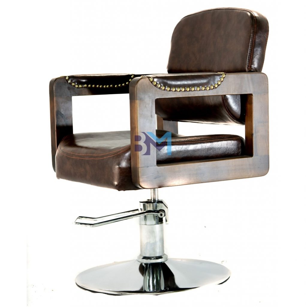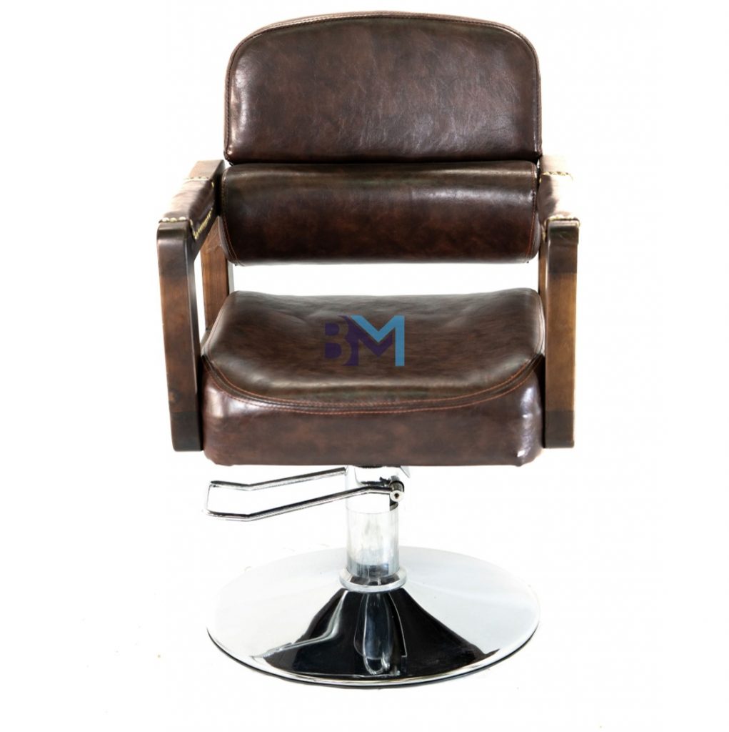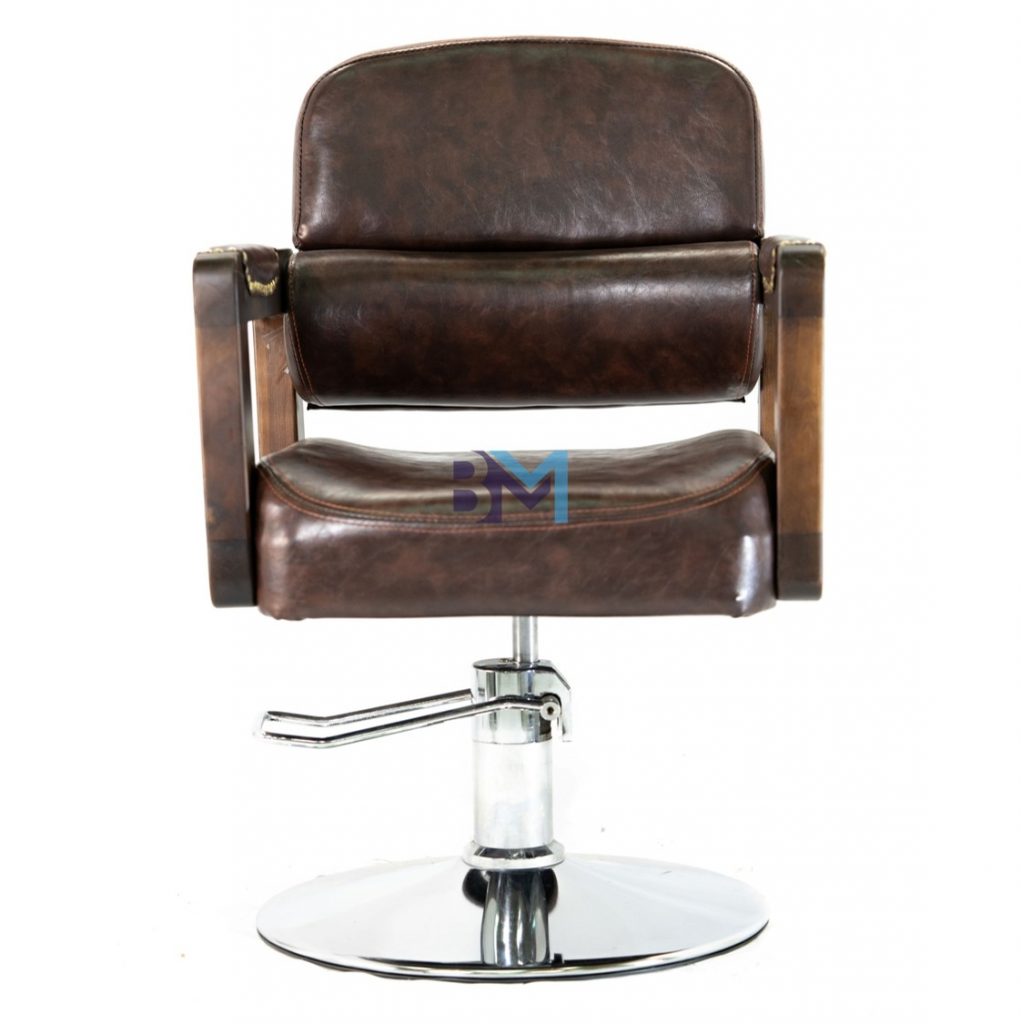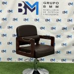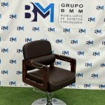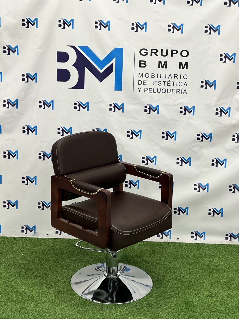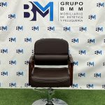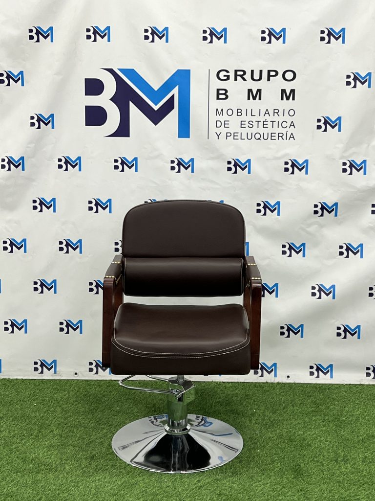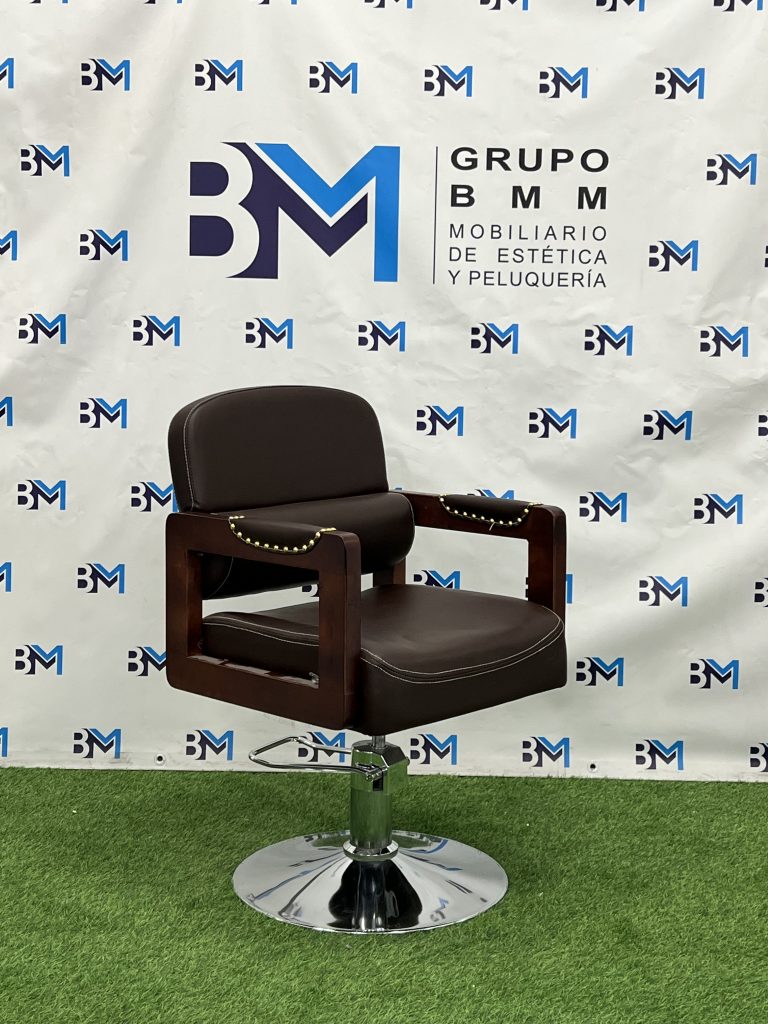 Silla de peluquería en polipiel color marrón con apoyabrazos de madera