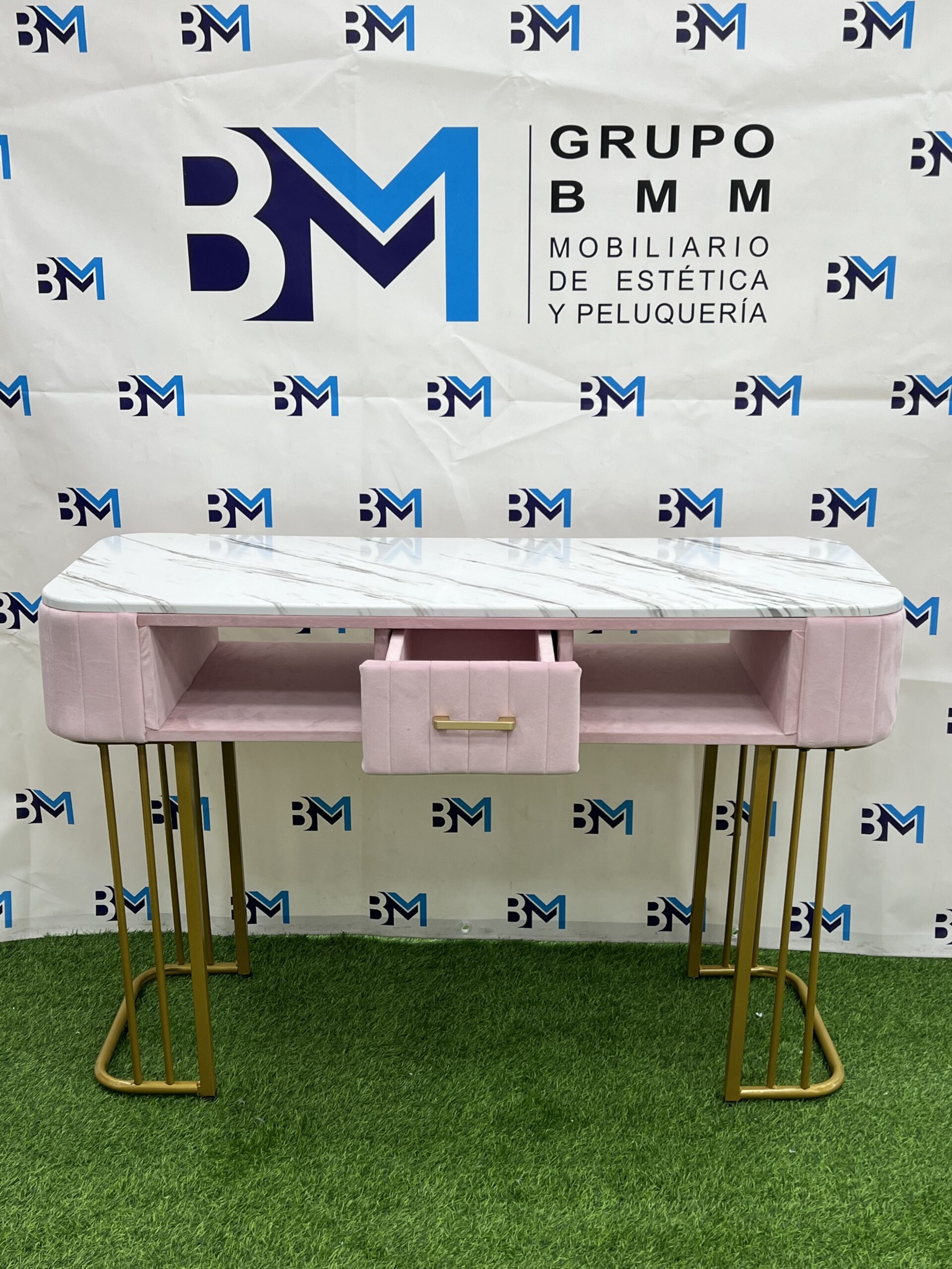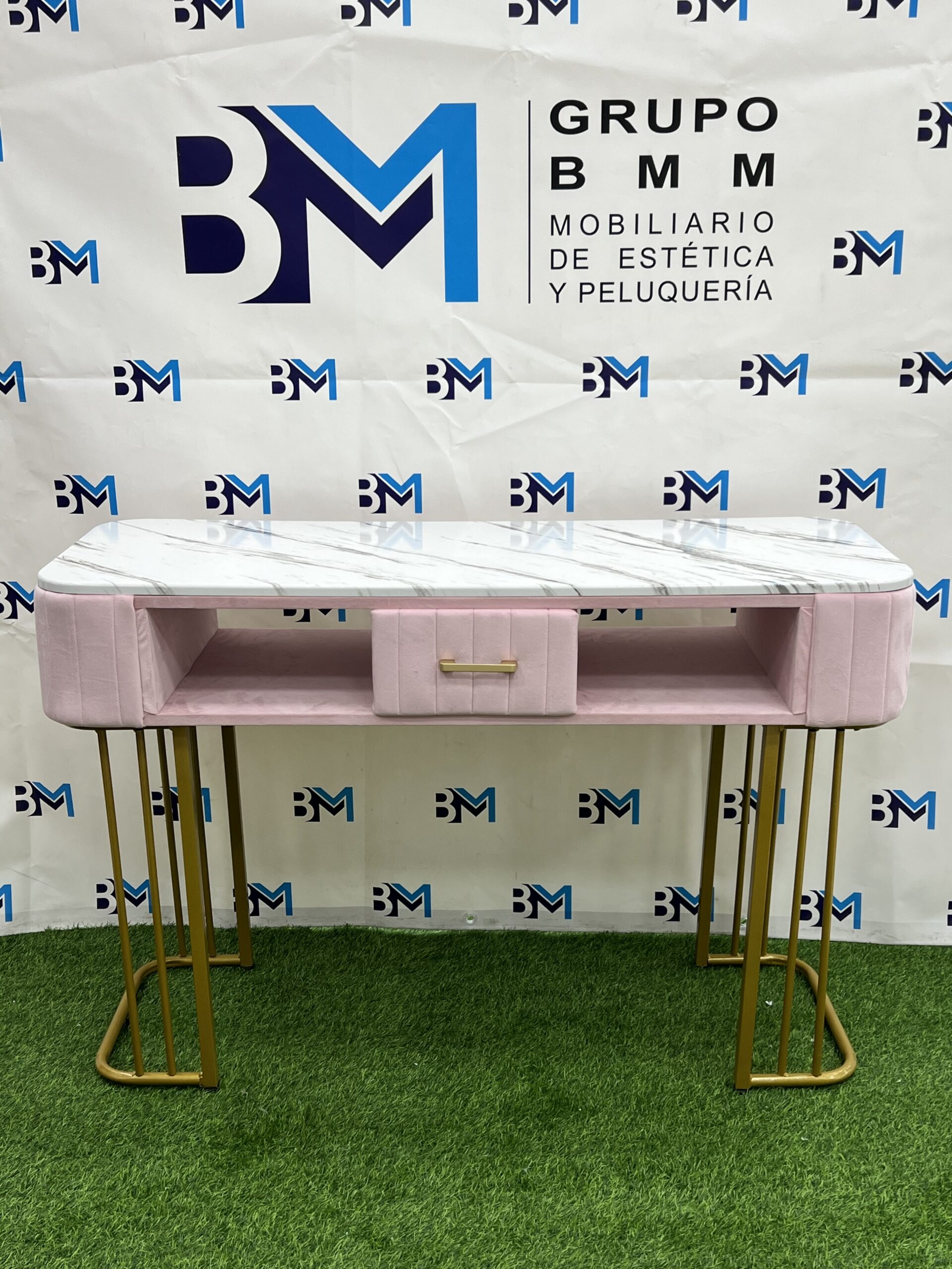 Mesa de manicura doble rosado y dorado con tope de madera tipo mármol