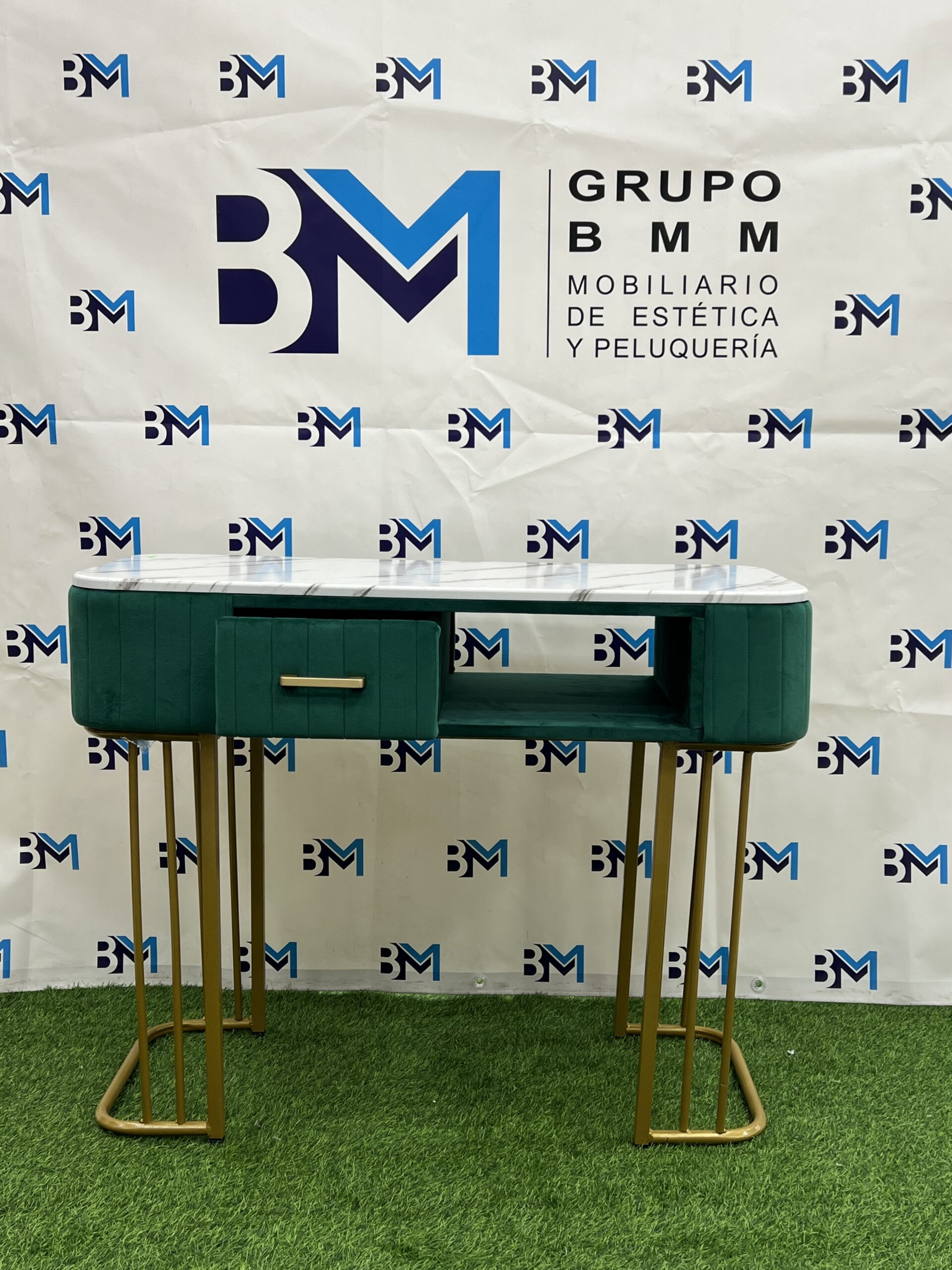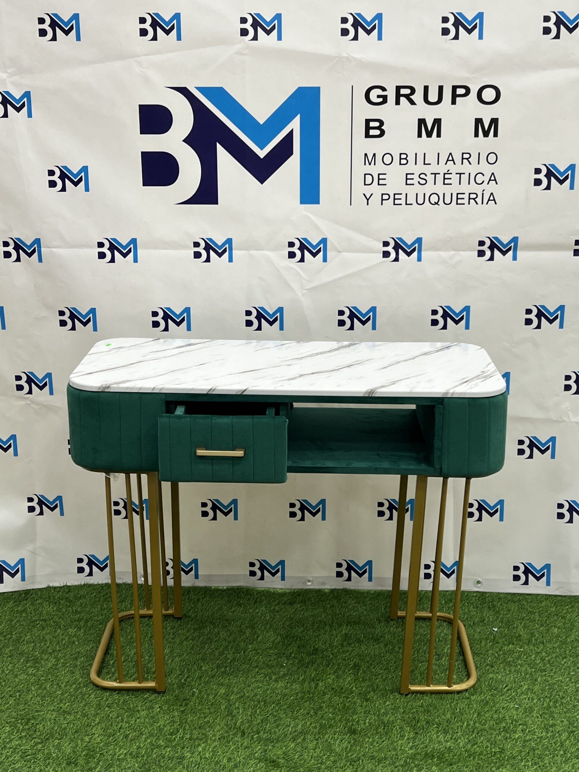 Mesa de manicura individual verde y dorado con tope de madera tipo mármol