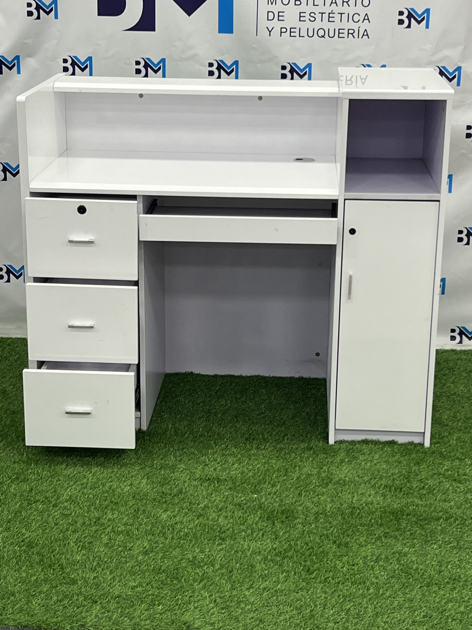 Mostrador de recepción blanco y verde