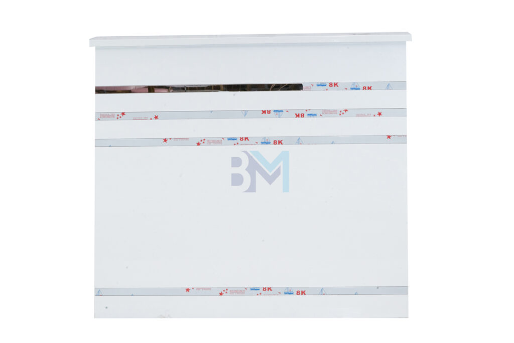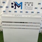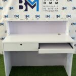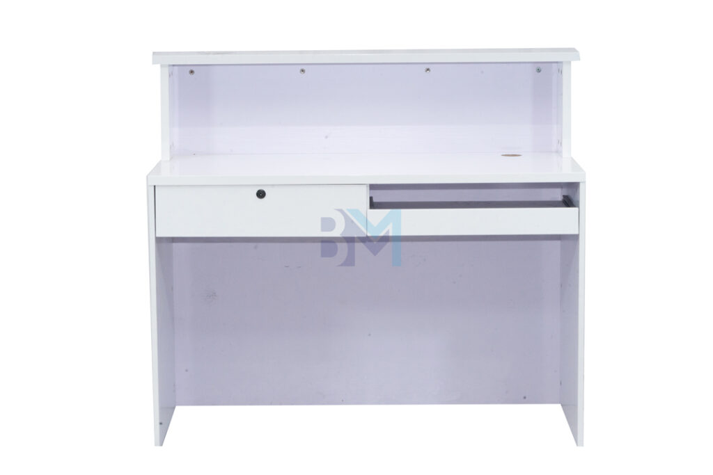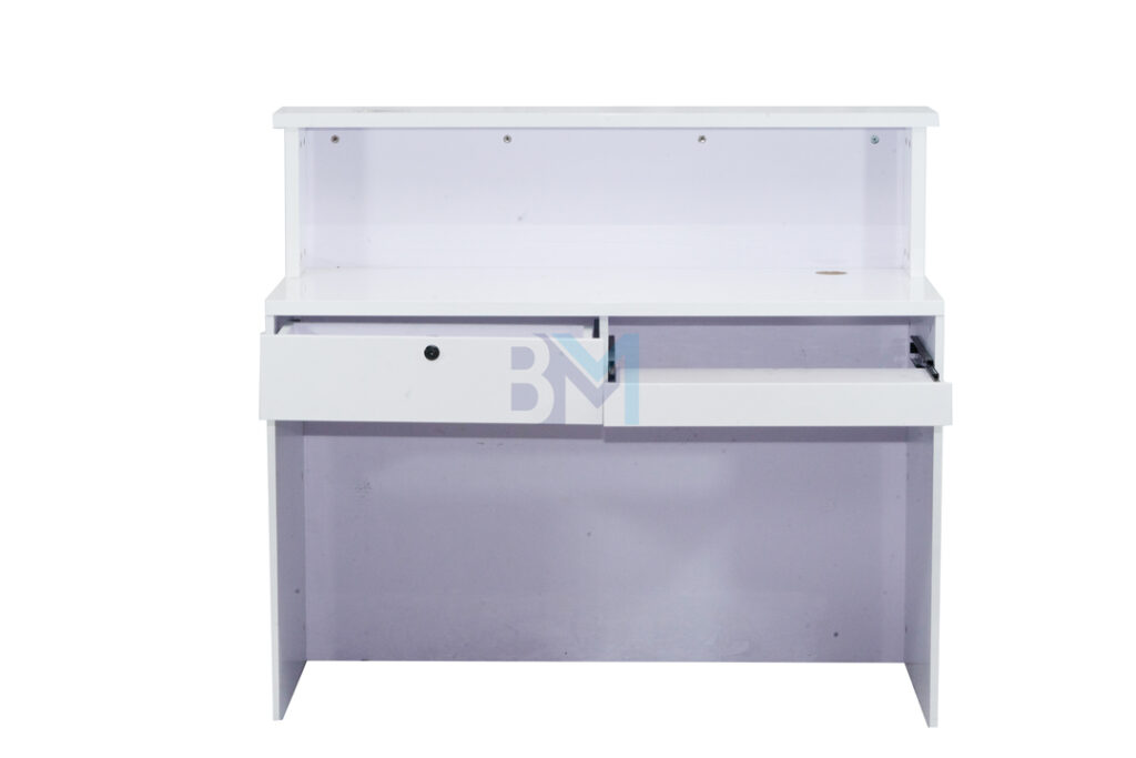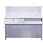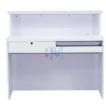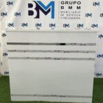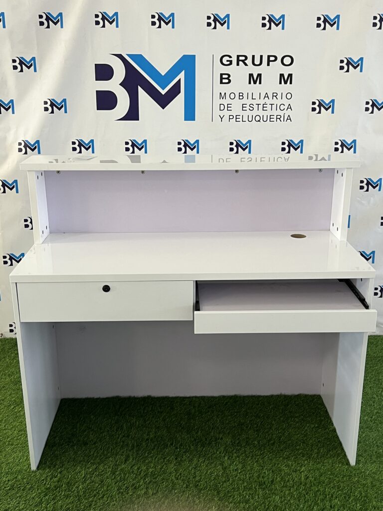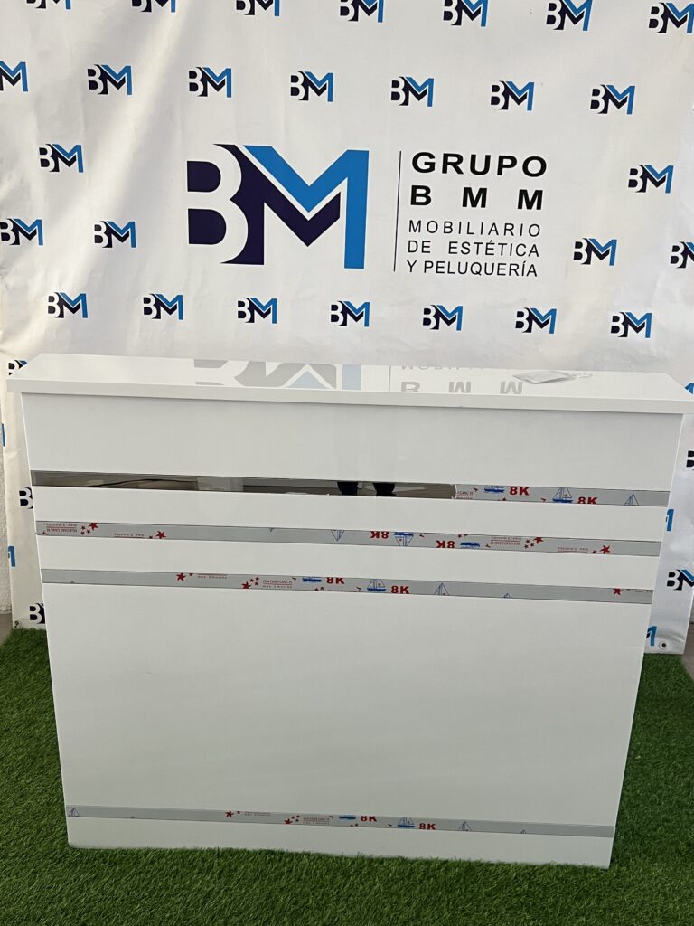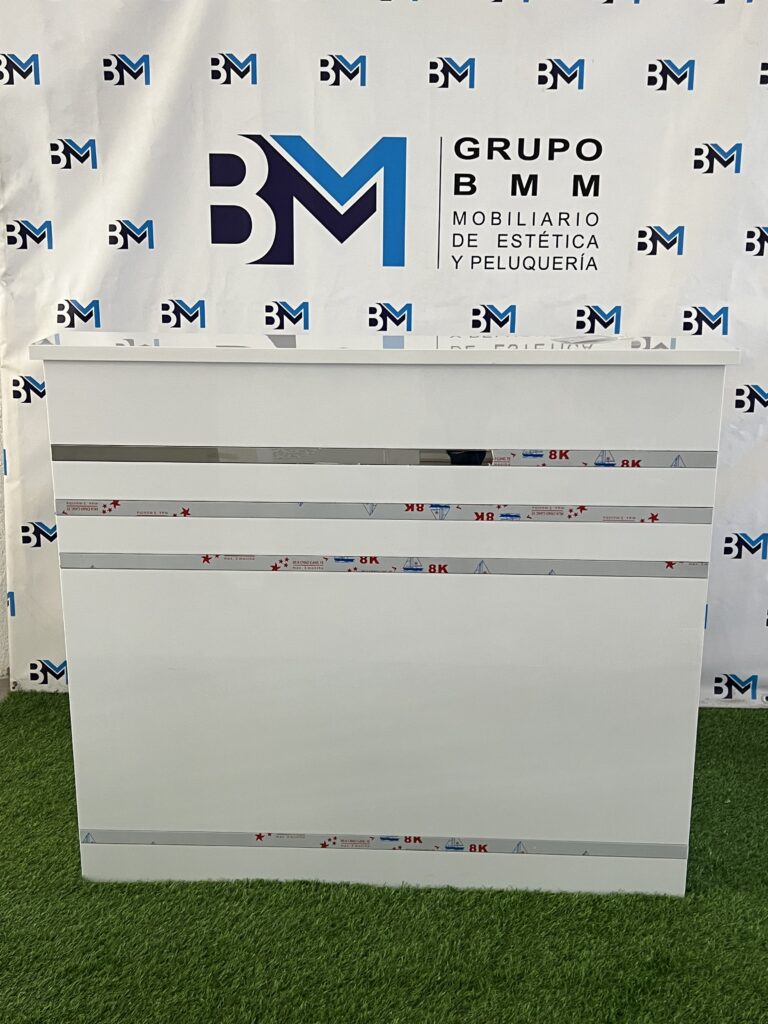 Mostrador de recepción blanco y plateado