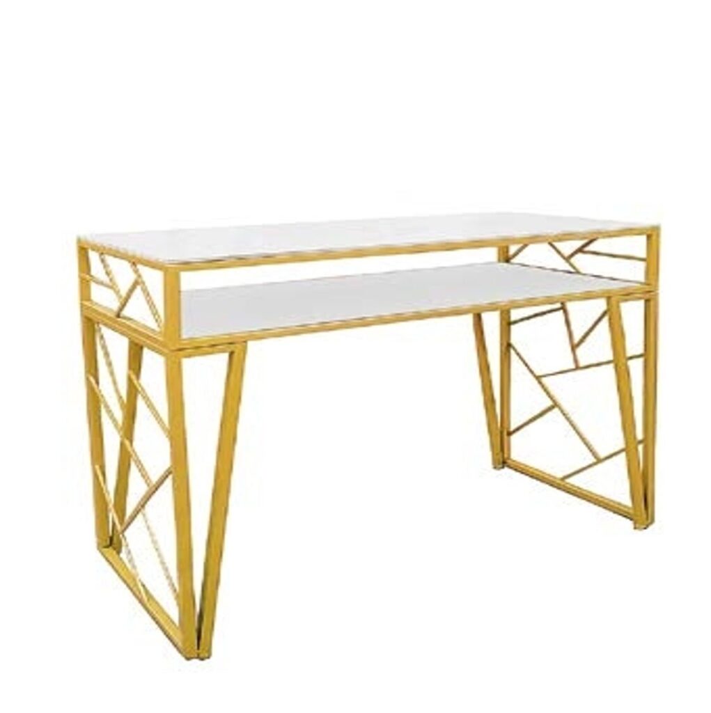 Mesa de manicura doble de metal dorado con tope de porcelana tipo mármol