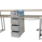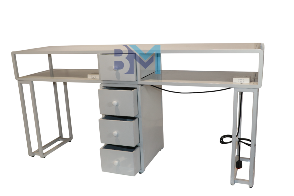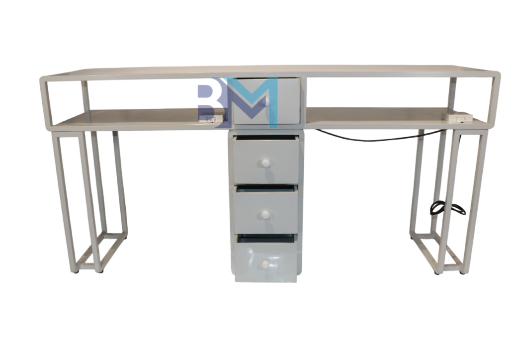 Mesa de manicura doble de metal blanca con superficie de piedra tipo mármol