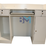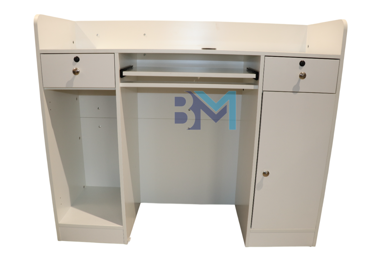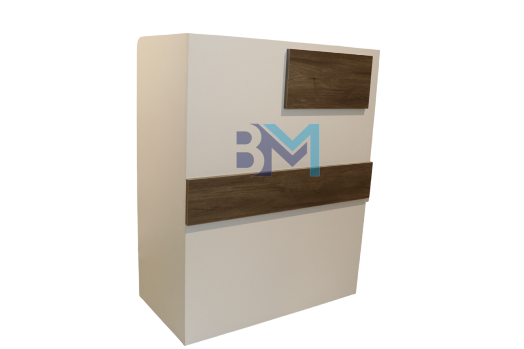 Mostrador de recepción blanco y madera