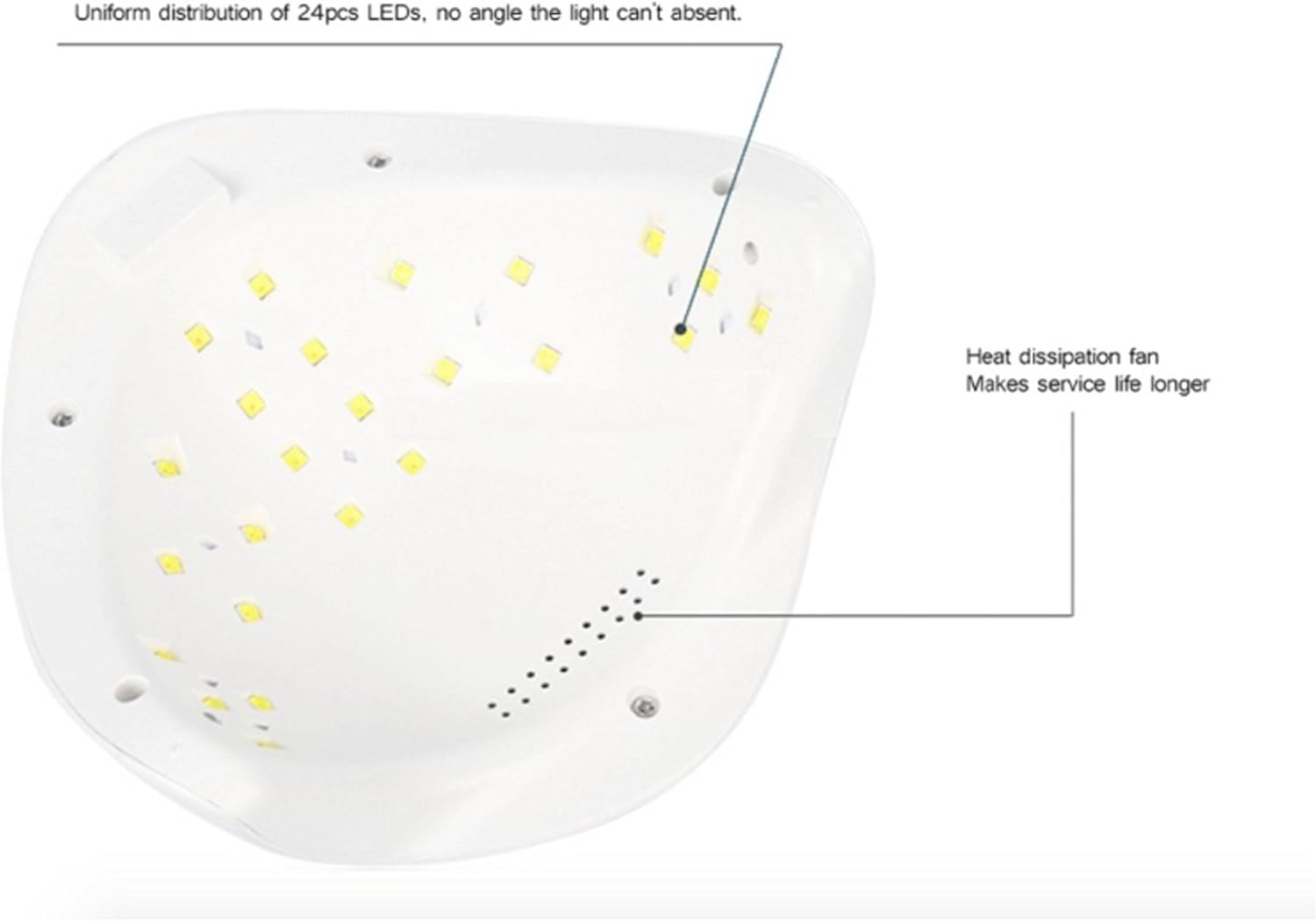 La lámpara tiene 24 diodos, que asegura el secado más completo tanto en la manicura como en la pedicura.  La cantidad de los diodos en este modelo es máxima entre todos los modelos de lámparas SUNUV.