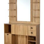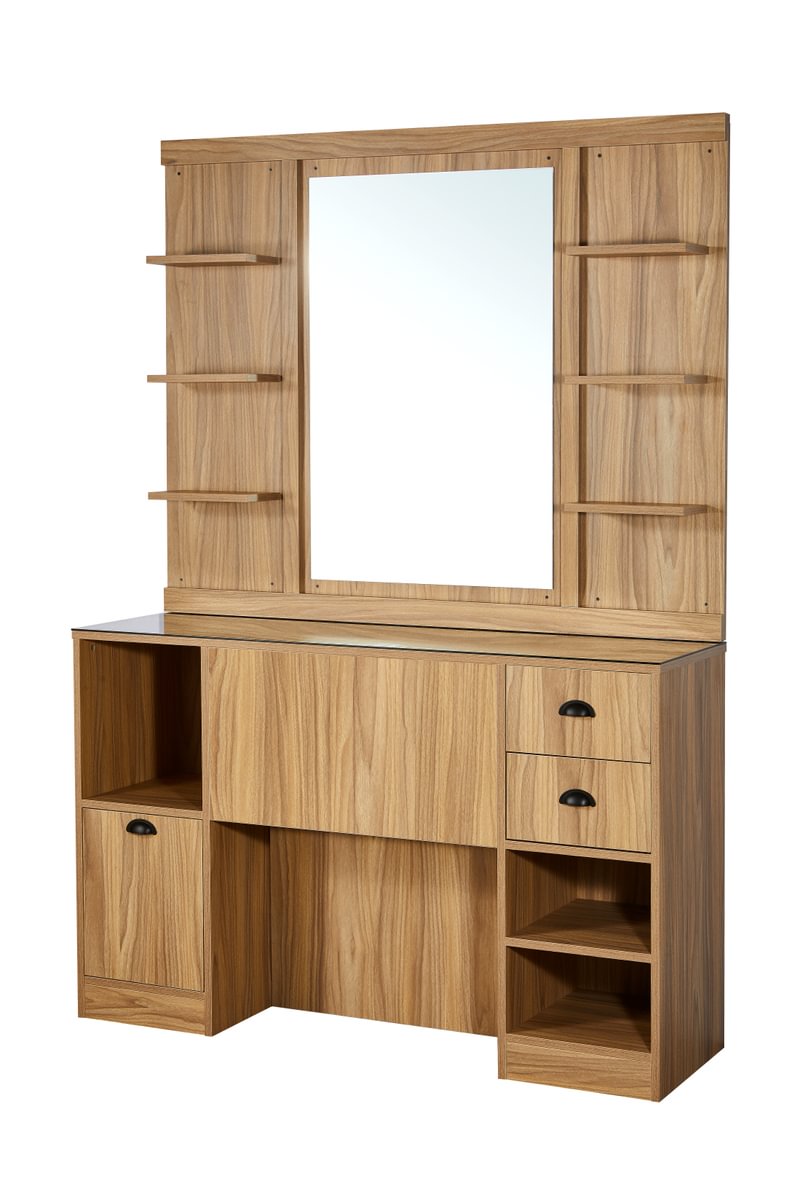 - Tocador de barbero acabado en melamina de madera oscura o clara.