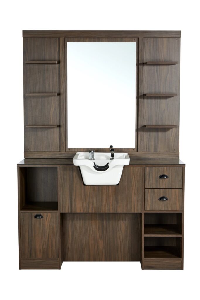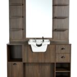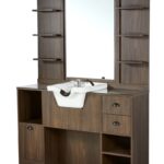 Espejo tocador marron osc con lavacabezas blanco Oke